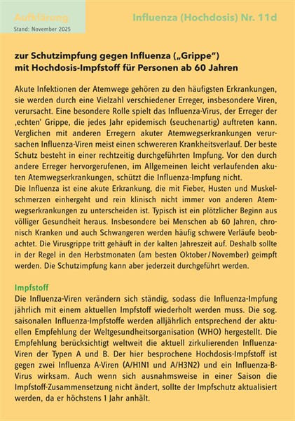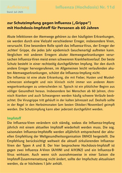 Aufklärungsbogen für den von der STIKO empfohlenen Hochdosis-Impfstoff gegen Influenza für Personen ab 60 Jahren.